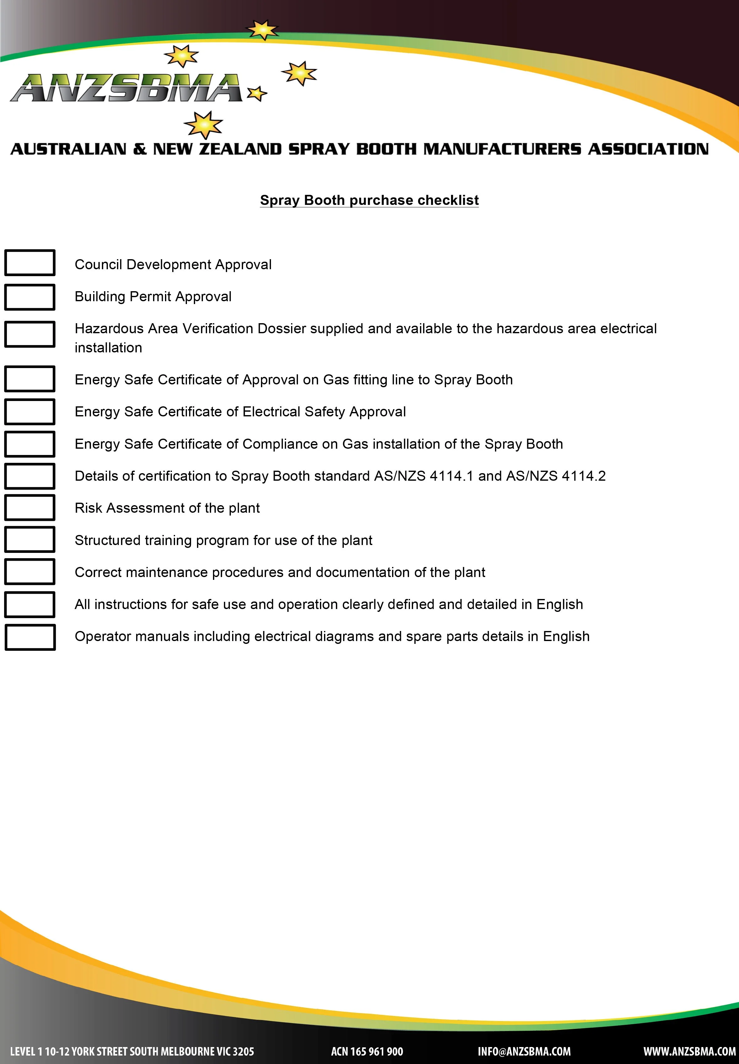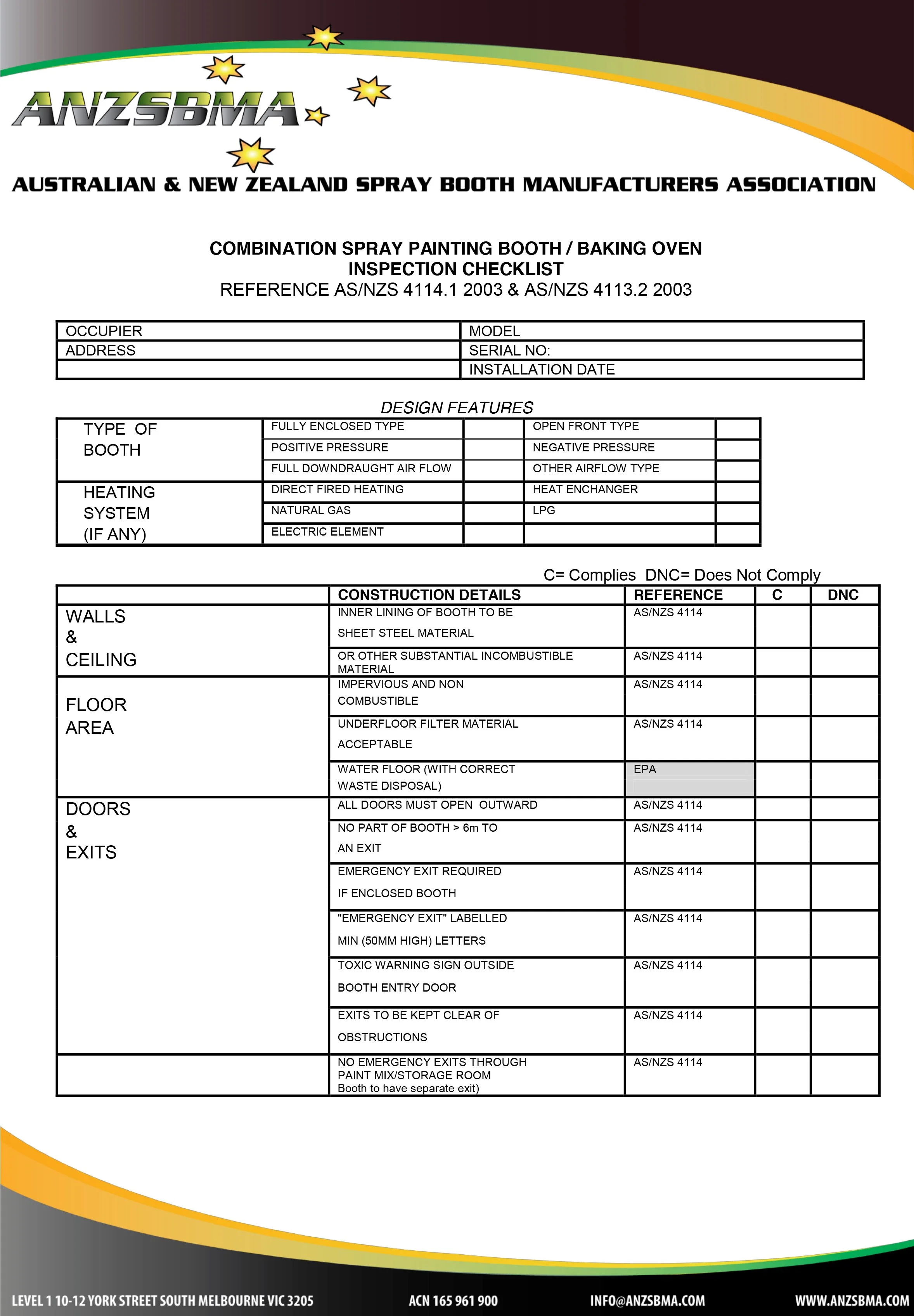 A checklist to verify if your spray booth is compliant against AS/NZs 4114:2003.1 and AS/NZs 4114:2003.2.