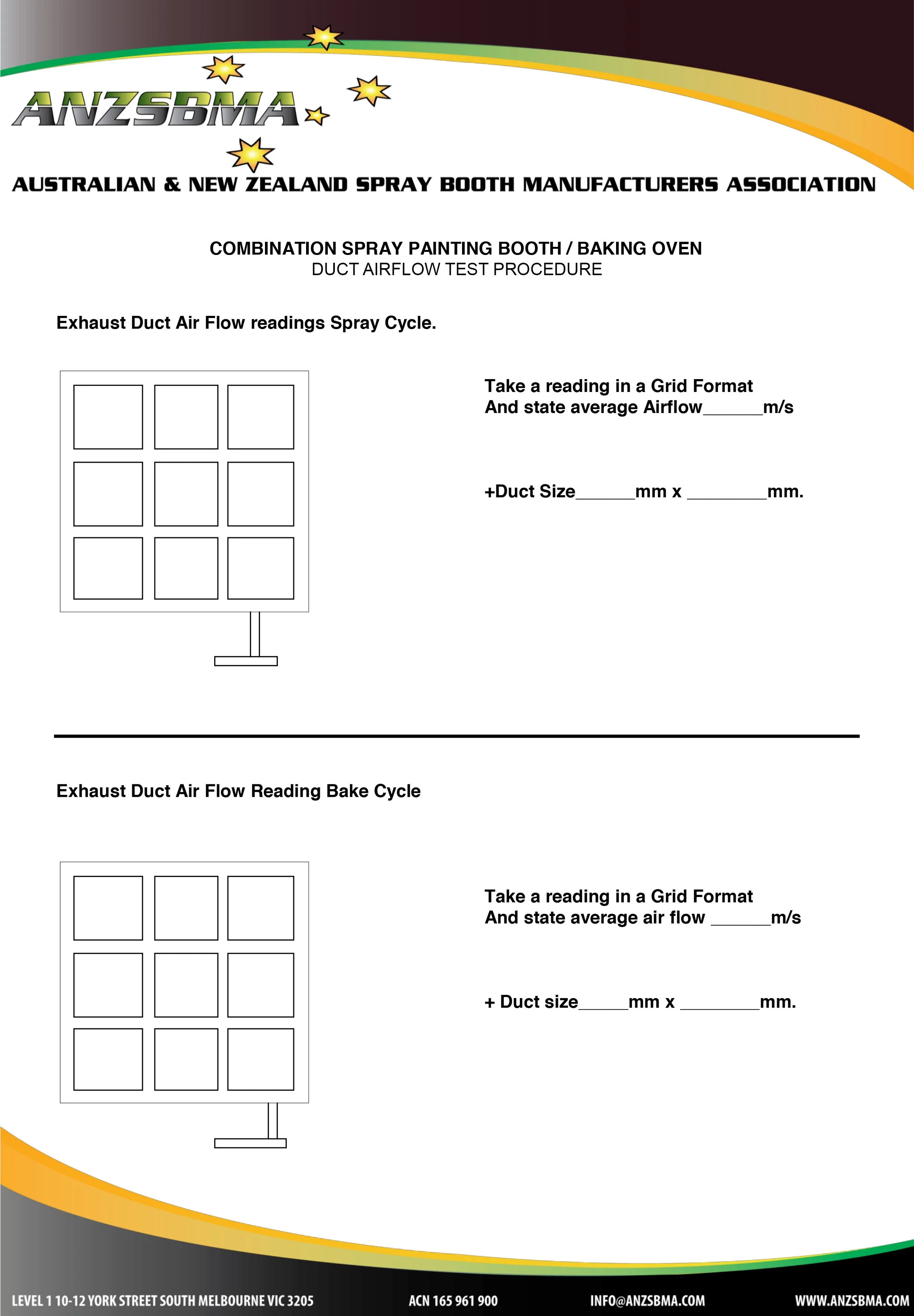 A test sheet to ensure spray booth exhaust ductwork airflow testing is done in accordance with in accordance with AS/NZs 4114:2020.